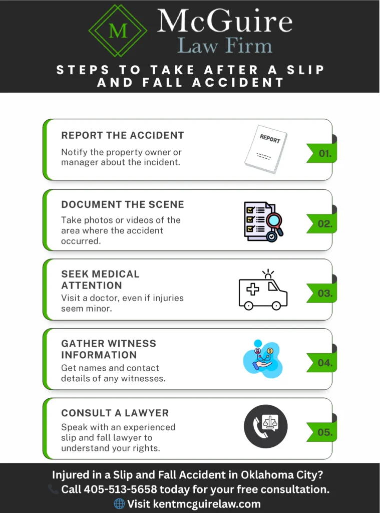 After a slip and fall accident, prioritize your health and safety. Seek medical attention if necessary, and if possible, gather evidence such as photographs of the scene and contact information of any witnesses. It’s also crucial to report the incident to the property owner or manager. After your injuries have been assessed you will want to contact McGuire Law Firm to see what legal options you have.